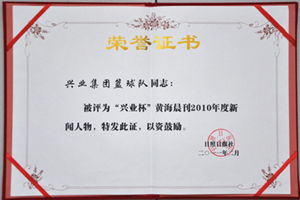 ·2011年2月,興業(yè)集團(tuán)藍(lán)球隊(duì)被評為“興業(yè)杯”黃海晨刊2010年度新聞人物,特發(fā)此證,以資鼓勵